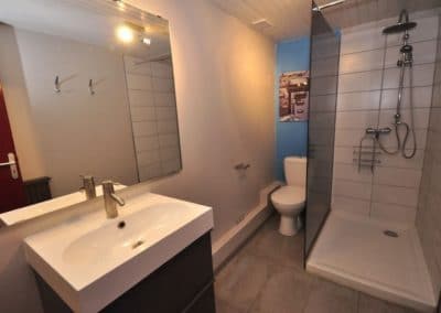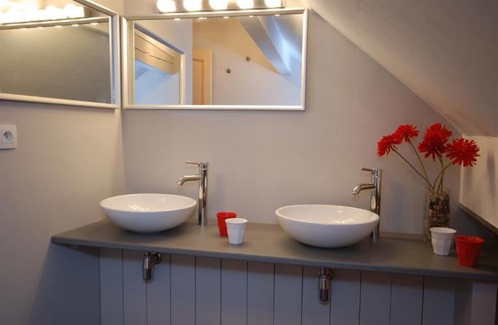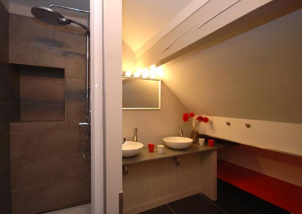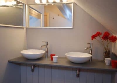 Salle de bain 1 à se partager pour ces 2 chambres : grande cabine de douche, double vasque, grand rangement et WC indépendant