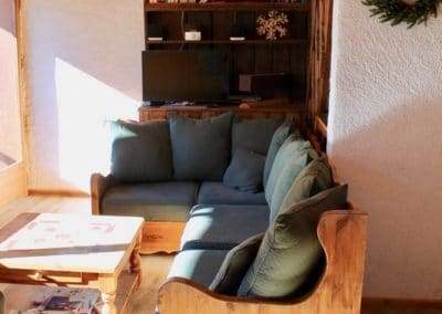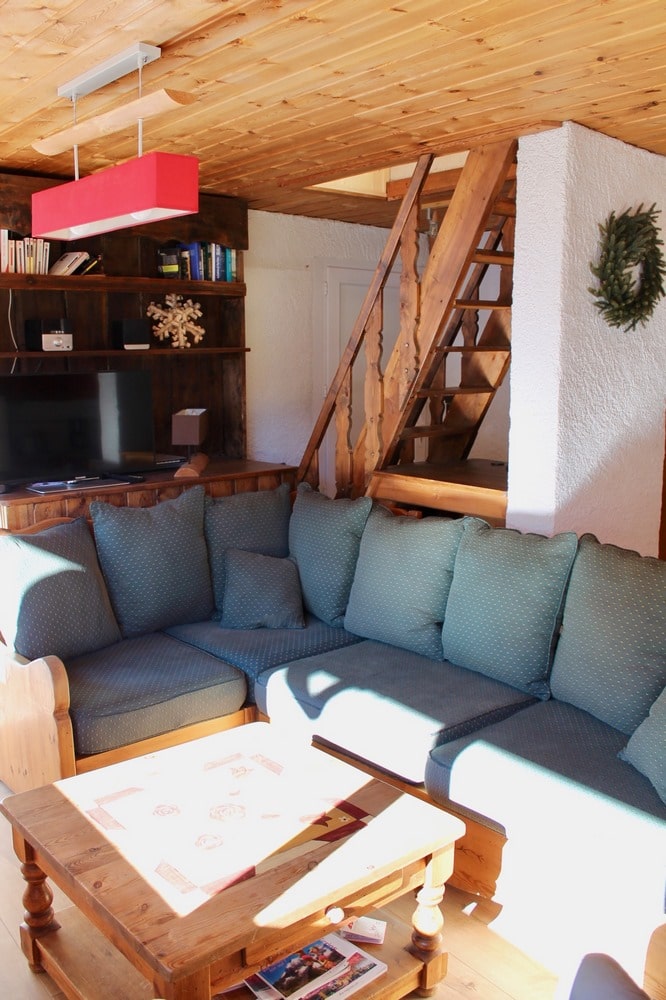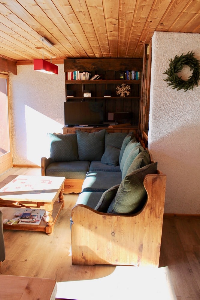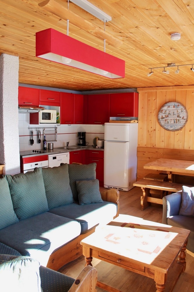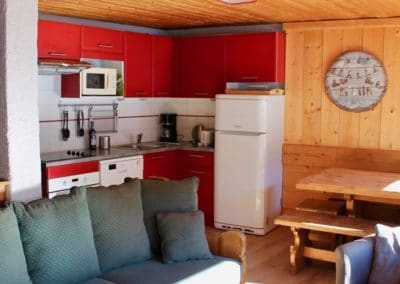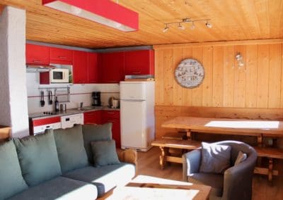Appartement 9 couchages, exposition salon, salle à manger, cuisine SUD OUEST : pièce à vivre très agréable sans vis-à-vis à l’étage, petit balcon plein Sud.